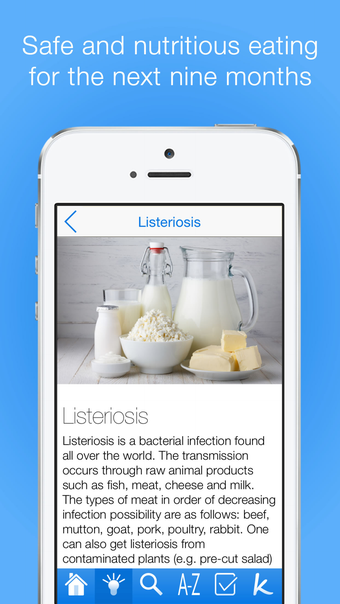 De app stelt gebruikers in staat om hun dieet aan te passen op basis van persoonlijke omstandigheden en zwangerschapstijd. Voedingsmiddelen worden geclassificeerd als groen, oranje of rood, waarbij groen veilig is, oranje afhankelijk is van verschillende factoren en rood moet worden vermeden. Met handige tips en een persoonlijke boodschappenlijst helpt de app aanstaande moeders om gezonde en veilige voedingskeuzes te maken tijdens hun zwangerschap.